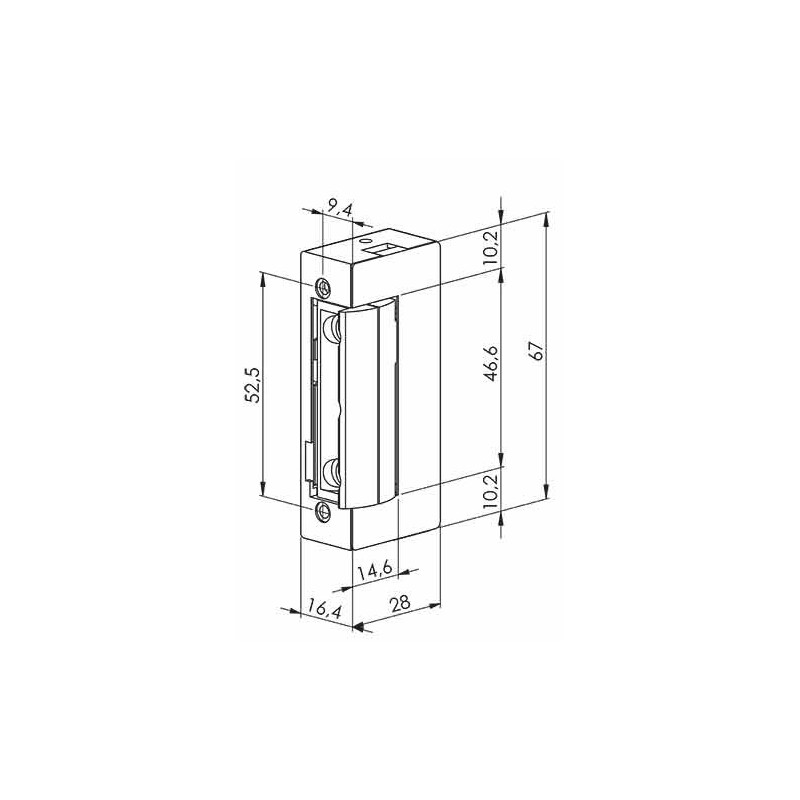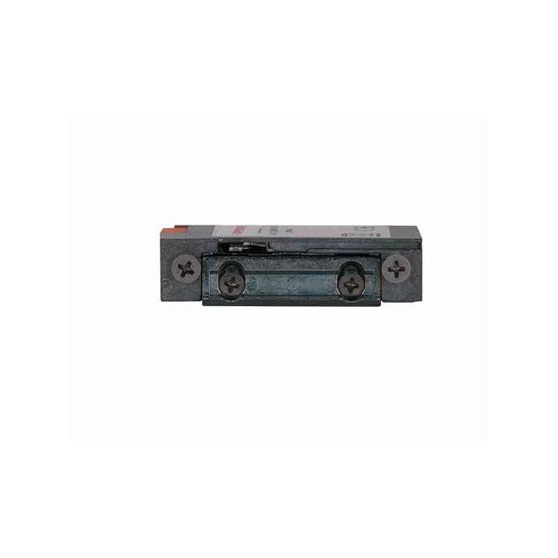 Simple electric strike for general use. Installation in the jamb (stock). Power supply with two conductors. Small dimensions, built-in mechanical memory (MM). Power supply 12 VDC. WIthout current = closed.