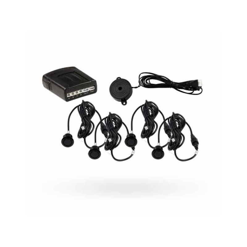 The kit contains 4 ultrasonic sensors to be installed in the rear plastic bumper. The main unit and the speaker are designed for installation into the interior of a car .
