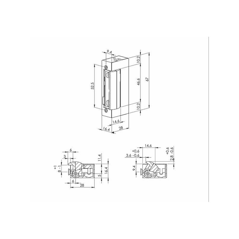 Jednostavni elektroprihvatnik za opću upotrebu. Ugradnja u dovratnik (štok). Napajanje sa dva vodiča. Male dimenzije, ugrađena mehanička memorija (MM). Napajanje 6-12 V AC/DC. Bez struje zatvoren.