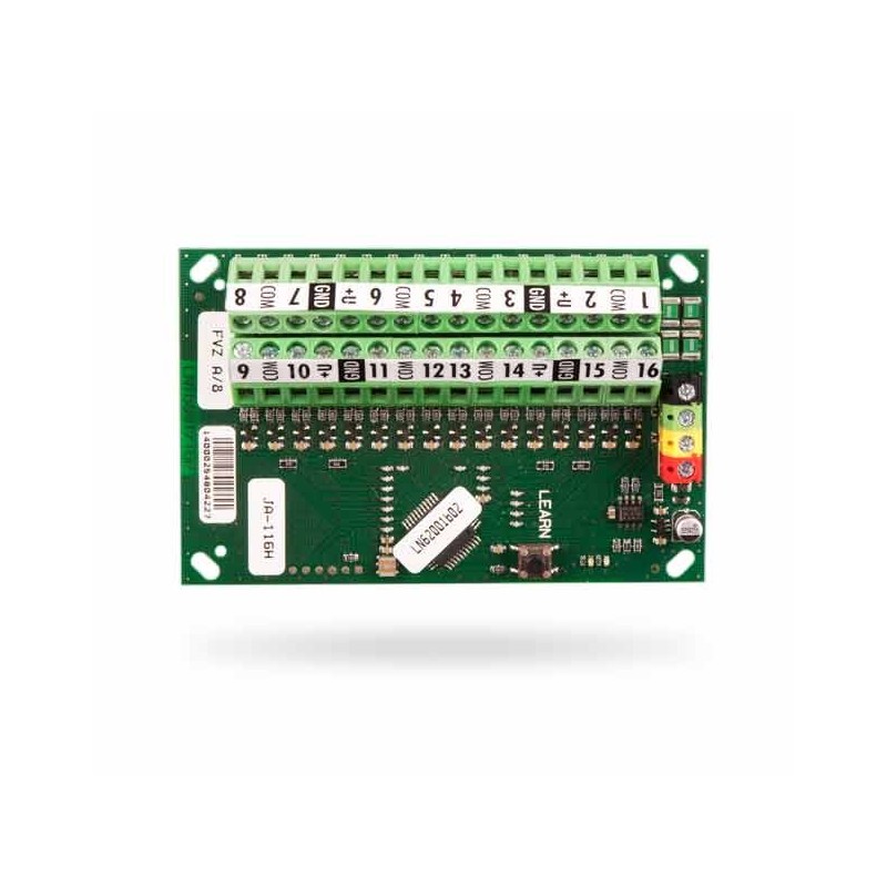 JA-116H BUS ekspander nudi mogućnost napajanja i spajanja do 16 konvencionalni žičanih detektora sa kontaktnim izlazima u sustav JABLOTRON 100. Reakcija svakog ulaznog signala može se samostalno programirati kao jedno-balansirani ili dvo-balansirani NC ili NO kontakt. Za uravnotežene ulaze moguće je odabrati jednu uobičajenu vrijednost spojenih otpornika. Podržane vrijednosti otpornika su 1k; 2k2; 3k3; 4k7; 5k6 i 10k. Modul se može instalirati izravno u centralnu jedinicu JA-106K ili drugu instalacijsku kutije zaštićenu kontaktom s tamperom.